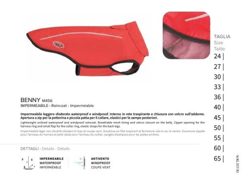 Könnyű, béleletlen víz- és szélálló esőkabát. Légáteresztő háló belsővel és tépőzárral a hason. Vízálló kivezető nyílás a hámnak, gumiszalagokkal rögzíthető a hátsó lábakhoz.