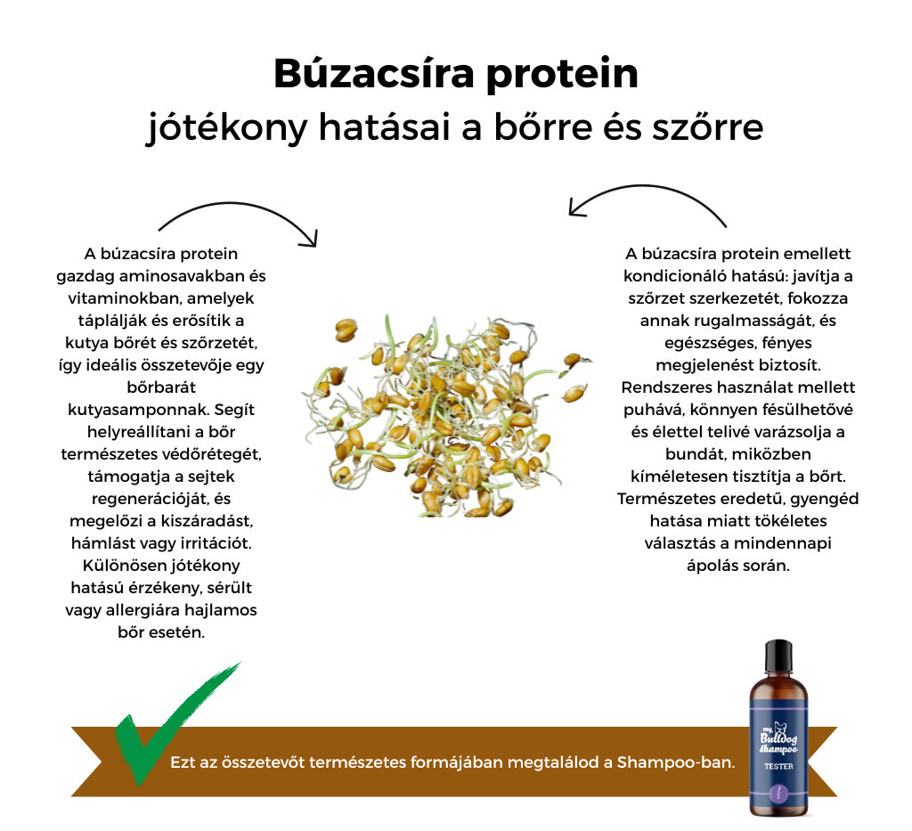 Búzacsíra protein: Erősíti a szőrzet szerkezetét, segít a regenerációban és csillogást ad a bundának.