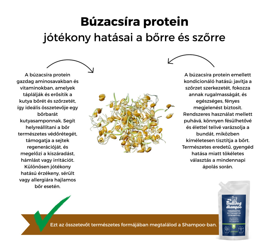 Búzacsíra protein: Erősíti és védi a szőrszálakat, segít a regenerálásban, és selymes tapintásúvá teszi a szőrzetet. B5-provitamin (panthenol) + E-vitamin: Segítenek a bőr hidratálásában, regenerálásában, nyugtatják az irritált területeket.