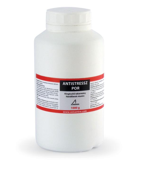 Az Antistressz por természetes anyagokat, vitaminokat, aminosavakat és ásványi anyagokat tartalmazó kiegészítő takarmány háziállatok részére a hirtelen megterheléssel, stresszel járó állapotok (falkásítás, kannibalizmus, oltás, szállítás, tolltépés stb.) esetére.