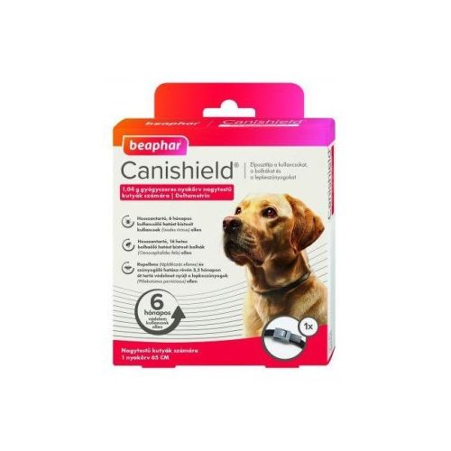 Beaphar CaniShield Repellens lepkeszúnyog, kullancs és bolha elleni nyakörv – Újgenerációs, Deltametrin hatóanyagú, hármas hatású: bolha, szúnyog és kullancs elleni nyakörv. Kizárólag külsőleg, a nyakörvet a nyak köré kell felhelyezni. Hatását 7 nap alatt fejti ki, és biztonságosan alkalmazható 7 hetes, vagy annál idősebb kölyök, valamint kis és közepestestű felnőtt kutyákon. A CaniShield nyakörv vízzel való érintkezése nem csökkenti a nyakörv hatásosságát. Macskákon nem alkalmazható.
