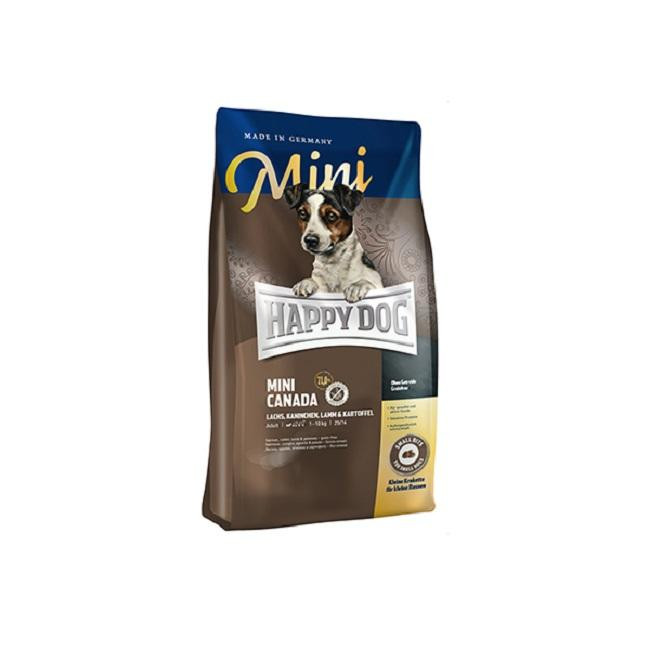 A Happy Dog Mini Canada egy teljes értékű eledel minden 10 kg alatti, alacsony energiaszükségletű, kistestű, felnőtt kutya számára, gabona nélkül, lazaccal, báránnyal és nyúllal. Kölyökkutyák számára is adható a 8. hónaptól.